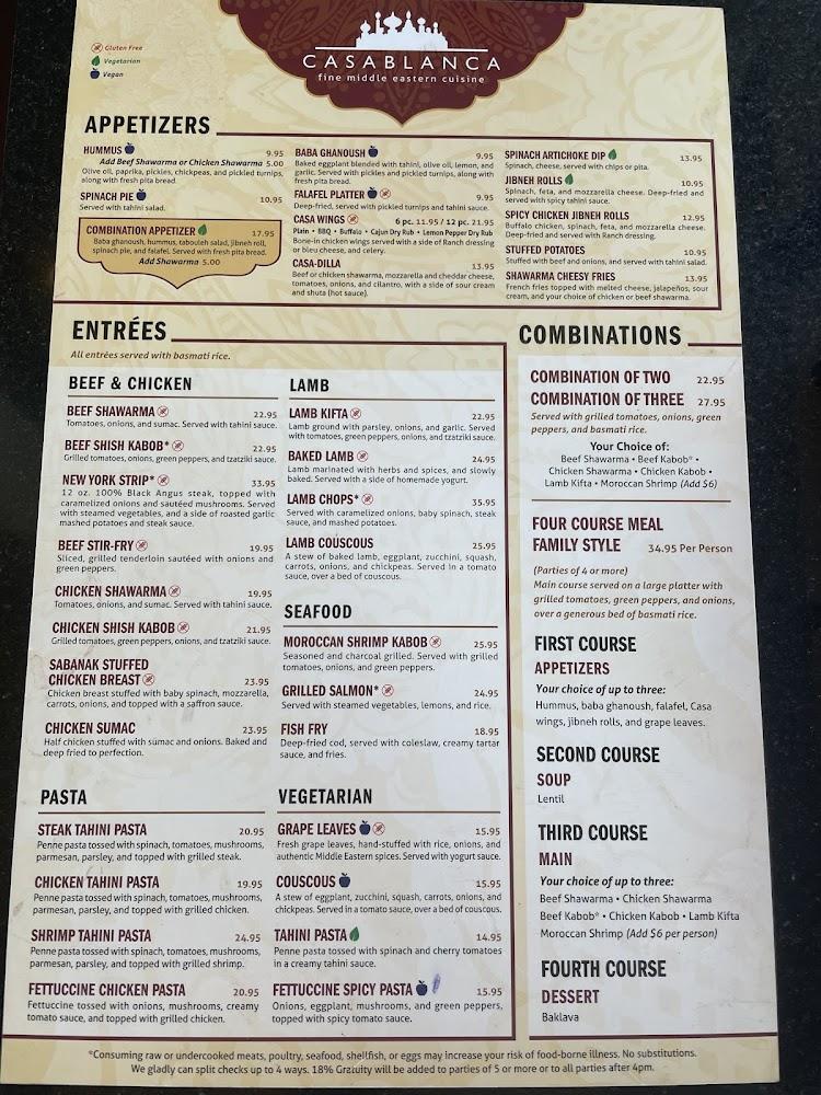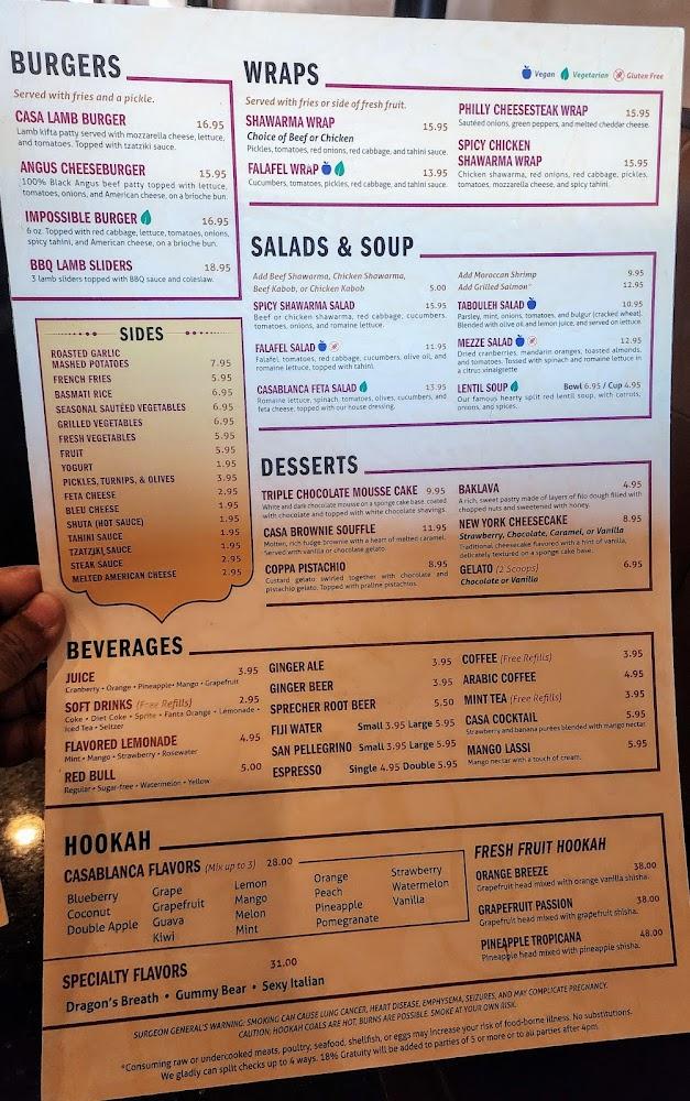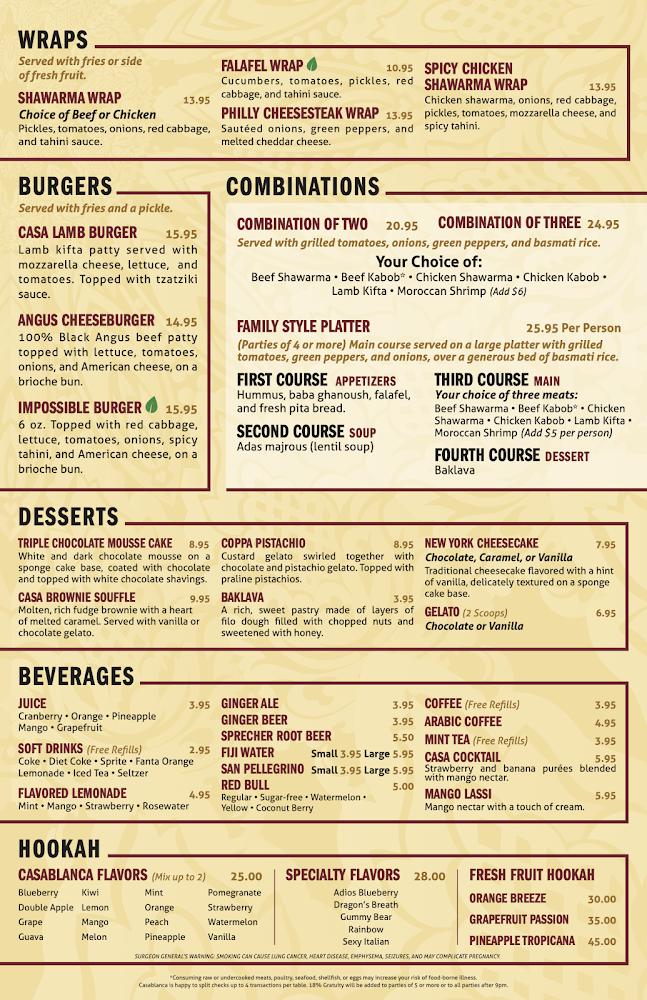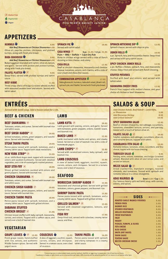 Casablanca offers a diverse menu featuring over 100 dishes across multiple categories. For appetizers, favorites include the spicy jibneh rolls and the shawarma cheesy fries, with average prices around $14.54. The entree selection shines, with offerings like lamb shank couscous and chicken shawarma, averaging $28.22.